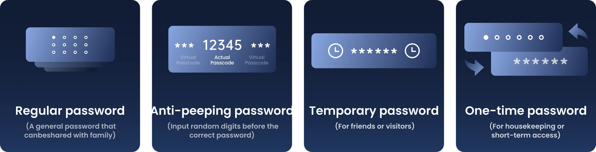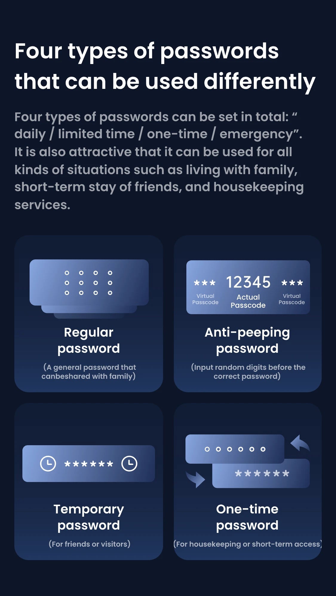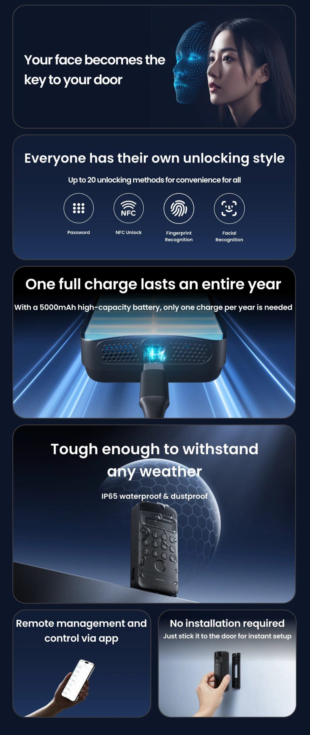 支援人臉辨識、指紋辨識、密碼辨識、NFC辨識、鑰匙辨識、語音辨識、應用程式辨識、藍牙辨識、智慧手錶辨識。
