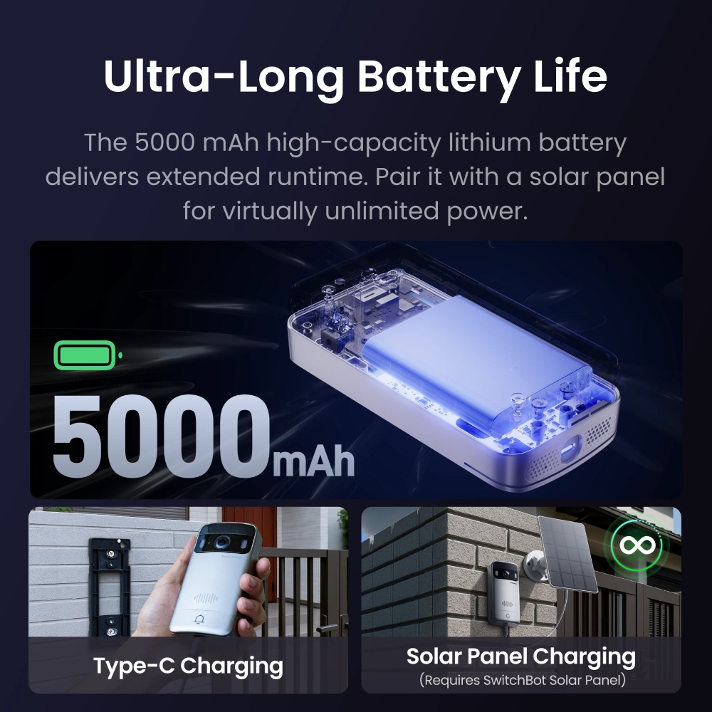 SwitchBot 視訊門鈴採用 5000mAh 電池和 ECoPower 技術,提供卓越的電池續航力和靈活的安裝方式。 (*在 SwitchBot 實驗室條件下測試。實際性能可能有所不同。)